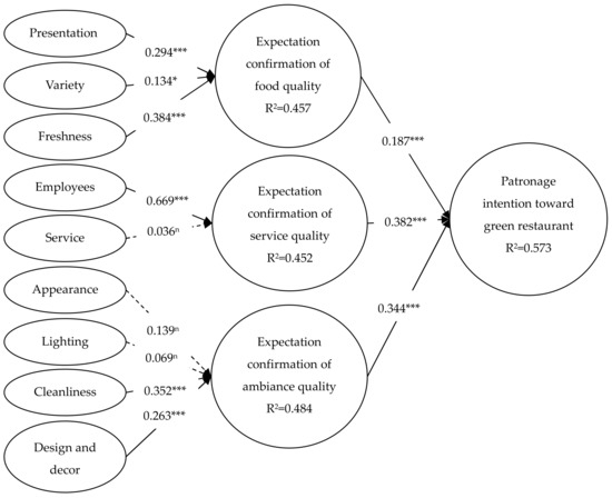 The results of the structural model test show that the standardization path coefficients were statistically significant (p < 0.05), except for the path coefficients of service for the expectation confirmation of service quality, and appearance and lighting for the expectation confirmation of ambiance quality. The R2 of the expectation confirmation of food quality, service quality, ambiance quality, and patronage intention were 0.457, 0.452, 0.484, and 0.573, respectively (Figure 2).