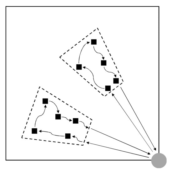 In Figure 1, a freight-delivery region is described by a square with solid lines, and a grey circle at the right-hand corner represents a distribution center. A large number of freight demands (i.e., customers) are assumed to be randomly distributed within the solid-line square. Trucks from the distribution center need to deliver the products to the customers, some of which are represented by small black squares in this figure. The objective of this problem is to minimize the total cost, the total truck-shipment distance, in order to satisfy the freight demand of the large number of customers. The ring-sweep algorithm assumes identical customers comprise each freight demand point, and the same products are distributed from a single distribution center to each demand point. The freight-delivery region represented by a square with solid lines splits into many delivery zones such as small trapezoids with broken lines. Freight demand in one trapezoid need to be satisfied by one freight truck, i.e., the total demand in one delivery zone is the same as the capacity of one freight truck. Then, a set of trucks needs to travel back and forth between the distribution center and the border of their assigned delivery zones, which is generally described as the line-haul movement. Also, each truck has to visit every demand point within a zone to serve the customer, which is generally described as the local travel. A near-optimal solution to this problem can be computed by summing the line-haul movement distance and the local travel distance across all the divided freight zones in a given region without actual vehicle movement tracking. A set of equations to obtain the near-optimal total vehicle-distance with proof are provided in Newell and Daganzo []. To compute the total cost for collecting the freight, the same methodology can be applied assuming that significantly large number of supply points (i.e., producers), instead of demand points, need to be served in a freight region, i.e., an origin of the freight shipment. Note that this study can be considered as the routing problem at the second level in a two-echelon distribution system [,] since the distribution centers in this study correspond to the intermediate depots in two-echelon VRP and the location of each distribution center is assumed to be given.