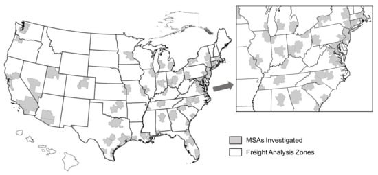 The concept of the freight analysis zone (FAZ), originally defined in Freight Analysis Framework version 3 (FAF3) [], is adopted to represent geographical regions with regard to freight activities (i.e., origins and destinations of freight shipment). Figure 2, adapted from FAF3 [], shows a map of the 123 domestic FAZs. Note that the regions in grey represent the study sites investigated in this paper. Also, the East Coast areas are magnified to improve recognition accuracy.