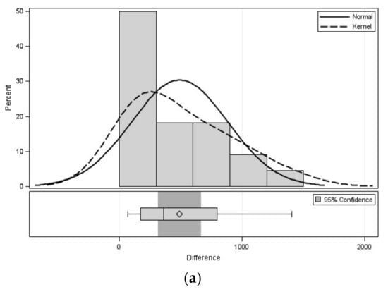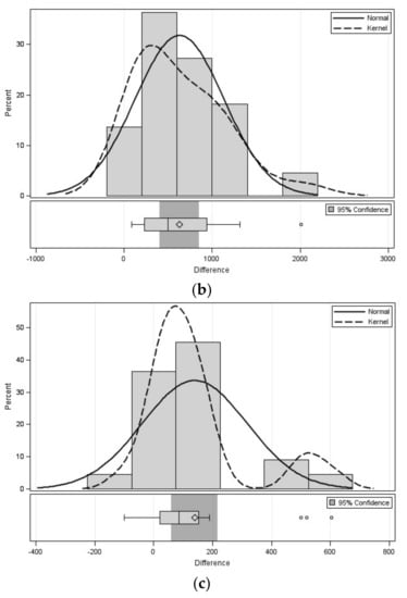 Paired t-test results. (a) Paired t-test results of the total travel distance in 2050 between scenario 1 and scenario 2; (b) paired t-test results of the total travel distance in 2050 between scenario 1 and scenario 3; (c) paired t-test results of the total travel distance in 2050 between scenario 2 and scenario 3.