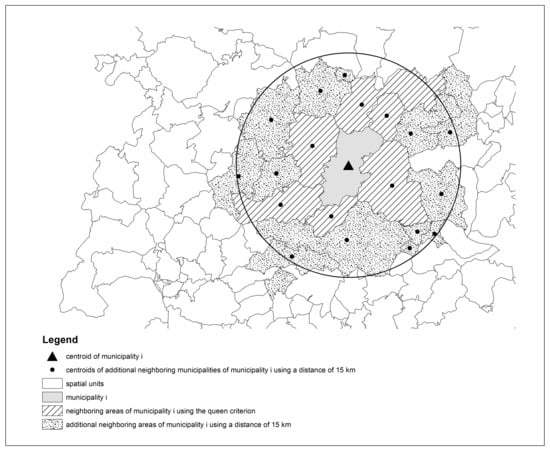 On the one hand, Figure 1 shows the spatial relationships for municipality i according to a queen contiguity scheme. In analogy with the game of chess, the queen criterion states that municipalities are neighbors for municipality i only if they share a common border or vertex with i on the map [27,30]. This is depicted by the striped spatial units in Figure 1. Hence, municipality i has six neighbors according to the queen criterion. On the other hand, Figure 1 shows the spatial relationships for municipality i according to a distance contiguity scheme. Here, municipalities are neighbors for municipality i only if their centroids are within a specified radius around i. This is depicted by the sum of the striped and speckled spatial units in Figure 1. Hence, municipality i has 19 neighbors in total using a radius of 15 km. If two municipalities are neighbors according to the neighborhood criterion, they receive a relationship in the matrix of one, otherwise zero. The diagonal elements of the matrix are usually set to zero, so municipalities are not considered neighbors to themselves [31].