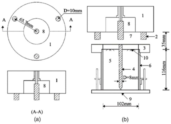 Configuration of (a) coaxial head; (b) coaxial cylinder 1: stainless steel in the coaxial head; 2: studs; 3: stainless steel ring; 4: central rod; 5: soil or water in the mold; 6: metal mold; 7: air gap; 8: Delrin as the insulating material in the coaxial head; 9: Delrin as the base of the mold; 10: soil or water surface [10].