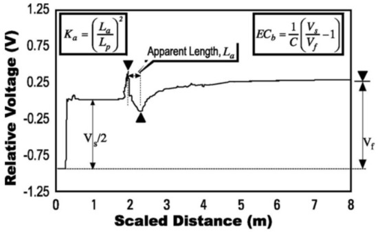 In Figure 2, is the length of the rod penetrated into the soil, and is the apparent distance between the first reflection point and the second reflection point of the electric pulse. is a voltage twice the magnitude of the step pulse, and is a long-term voltage level. is a constant related to the structure of the probe, which is defined as Equation (3) [18,19], where is the internal resistance of the TDR signal generator and is typically .