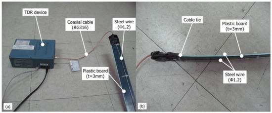 The configuration of the distributed TDR sensor shown in Figure 3 is similar to that made by Worsching et al. [13] and Scheuermann et al. [14]. Finally, it consists of a metal conductor that transmits electric pulses through the soil and a coaxial cable for connection with the TDR device. In this study, steel wire was used, whereas flat ribbon cable was used for Worsching et al. [13] and Scheuermann et al. [14]. The difference between these metal materials is related to the initial value of the electric pulse, but there is no problem if the same metal is used only when making the sensing line. In these papers, PVC was coated, but the TDR measurement lines of this study were not coated. To prevent shorting of the two steel wires, a plastic board was placed in the center and fixed with a cable tie. In this study, steel wire was used because it is possible to store and transport the made line-type sensing lines in roll form, which made it is easy to penetrate boring hole in the field.