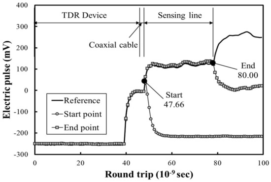 The two-dimensional electric waveform of Figure 5 was removed because the value of the coaxial cable and the inside of the TDR device are also measured. Therefore, it is necessary to measure the starting point and the end point of the electric waveform after manufacturing a line-type sensing line. Generally, two points are found by attaching the conductor. Figure 5 shows the results of measuring the electric pulses of a line-type sensing line with a length of 2.0 m. The starting point was measured as and the end point as . The electric waveform of the line-type measurement line shown in Figure 5 is the same as the previous research [13,14].