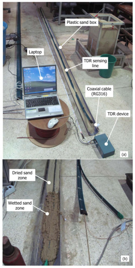 Figure 6 is laboratory experiments to calculate the calibration equations for voltage of electric pulse and degree of saturation of soil. Figure 6a sets up the equipment for the laboratory experiment. The experimental equipment consists of a soil box, a sensing line, a TDR device, and a laptop. Then, the wetted standard sand with the degree of saturation of 30%, 60%, and 100% was filled in the top, middle, and bottom of the soil box with a width of 50 cm. Figure 6b shows that the wetted standard sand with 60% of the degree of saturation is filled halfway into the soil box for photographing. The electrical waveforms were measured in nine cases, with different positions and the degree of saturation of wetted standard sand.