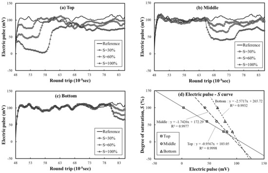 Figure 7 shows the electrical waveforms measured in nine cases, with different positions and degrees of saturation of wetted standard sand. Figure 7a–c is the electric wave in the case of the location of the top, middle, and bottom of the soil box filled with wetted standard sand. Figure 7d is the correlation between voltage of electric pulse and degree of saturation of soil.