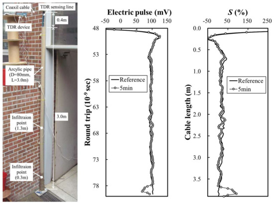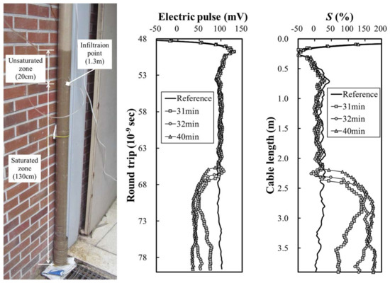 Figure 9 shows the view and result of the laboratory model simulation when it infiltrates at 1.3 m of the circular acrylic pipe. Figure 9a shows the electrical waveform after 40 min of infiltration water at 1.3 m of the circular acrylic pipe. It was visually confirmed that the unsaturated area was due to the capillary effect up to about 20 cm from the point where the infiltration water was injected. As shown in Figure 9b, the two-dimensional electric waveform measured by the distributed TDR sensor showed that the voltage of the electric pulse was reduced to in the . However, if infiltration continues, the voltage of the electric pulse is completely reduced to 50 mV after of the round-trip time. This is because if the infiltration continues, it is saturated to the point of 1.3 m of the circular acrylic pipe. The calibrated degree of saturation of Figure 9c shows that the saturation exceeded 100% from the cable length of 2.5 m. This is the same point where the actual infiltration water was injected and the groundwater level was formed.