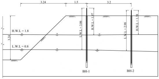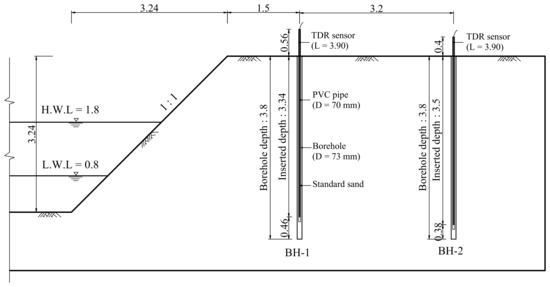 Figure 10 is a schematic view of the field experiment using the spatial-TDR sensor. The height of the experimental levee is 3.2 m and the slope degree is 1:1. There are two measurement points provided with the spatial-TDR sensors: BH-1 is 1.5 m horizontal distance from the crest of the levee and BH-2 is 4.7 m away. The water level of the river was 1.8 m in the high water level (HWL) and in the low water level (LWL). Since it takes time to change the groundwater level according to the water level of the river, it was measured after 10 days. The diameter of the boring hole is 80 mm in NX size. After penetrating the PVC pipe to prevent the boring hole from falling, the line-type sensing line was penetrated into it and homogeneously filled with dried standard sand. Finally, the casing, the PVC pipe, was removed from the boring hole. The depth of the boring hole of BH-1 is 3.8 m, the depth of line type line is 3.34 m, and the exposed length of the ground surface is 0.56 m. The depth of the boring hole of BH-2 is 3.8 m and the depth of penetration of the measuring line is 3.5 m. The exposed length is 0.4 m. Both sensing lines of the spatial TDR sensor were constructed with a total length of 3.9 m.