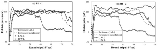 Figure 11 shows the two-dimensional electric waveforms of the spatial-TDR sensor measured in the field experiment. The electric waveform was measured at four conditions when the sensing line was prepared, the first being the initial value when installed in the laboratory experiment in Section 3.1, the second condition being immediately after installation on the levee, and the other conditions being reproduced with high water level and low water level. The initial values of BH-1 and BH-2 in Figure 11a,b all showed a constant voltage of electric pulse. Immediately after the installation on the levee, the electric pulse decreased due to the influence of groundwater. At the high water level of 1.8 m, the round-trip time, in which the electric pulse begins to decrease, was shortened to about . At the low water level of 0.8 m, the round-trip time was shortened to about .