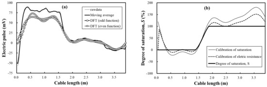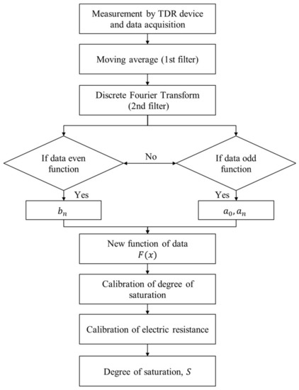 Figure 12 shows a flowchart of the filtering and calibration algorithm for the spatial-TDR sensors. First, a two-dimensional electric waveform is measured and data is acquired using a TDR device. The first-order filtering is performed using the moving-average method shown in Equation (7). Then, a discrete Fourier transform (DFT) is performed by the second-order filtering. Equation (7) applies if the data is an even function and Equation (8) applies if it is an odd function. A new function of rawdata is created by filtering a two-dimensional electric waveform with a moving-average method and a DFT. This corrects the calibration equation calculated in the laboratory experiment and the electrical resistance against the length of the steel wire. Finally, the degree of saturation of soil is calculated. Here, as shown in Figure 5, the conversion of the round-trip time of the electric pulse to the length of the sensing line is not included in this algorithm. This is because the conversion of the length is used to find and correct the starting and ending points of the manufactured sensing line.