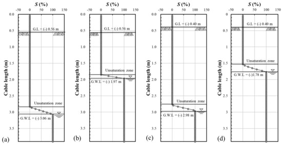 Figure 13a,b shows the groundwater level and unsaturated area of BH-1. In the LWL condition of BH-1 in Figure 13a, the groundwater level was estimated at 3.06 m and the unsaturated area at about 25 cm. In the HWL condition of BH-1 in Figure 13b, the groundwater level was estimated at 1.97 m and the unsaturated area was estimated at about 10 cm. Figure 13c,d are the results of estimating the groundwater level and unsaturated area of BH-2. In the LWL condition of BH-2 in Figure 13c, the groundwater level was estimated at 2.98 m and the unsaturated area was estimated at about 20 cm. In the HWL condition of BH-2 in Figure 13d, the groundwater level was estimated at 1.78 m and the unsaturated area was estimated at about 20 cm.
