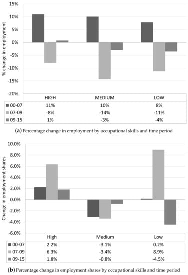 During the observed period 2000–2015, there have been some important changes in the labor market in Europe. Figure 1a shows the percentage growth in total employment by occupational skills before, during and after the crisis.