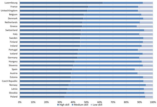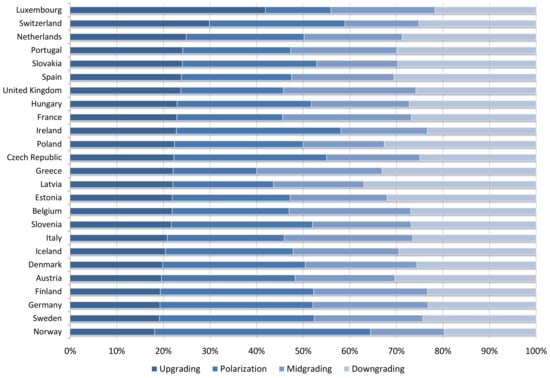 The second contribution of this paper consists in confirming the empirical finding of [26], who finds a plurality of patterns of structural employment changes in Europe, rather than the prevalent process of U-shaped polarization that is often found in the United States. However, differently from his study, we examine both country and sectoral patterns of employment structuring. In addition to skill upgrading and polarization patterns, at the sectoral level, we identify two additional trends, which we call skill ‘midgrading’ and ‘downgrading’. Skill midgrading is defined as a situation where the share of middle skill employment increases, while the shares of high- and low-skill jobs decrease or remain unchanged. (During the changes and transitions in the digital era, the term “middle-skill” has come to mean “digital skills”, and the marketplace for these new skill sets creates opportunities for individuals without a degree to demonstrate specific proficiencies, providing workers the ability to advance through their careers [27].) Skill downgrading is defined as a circumstance where the share of high-skill employment share decreases, while the share of low-skill employment increases. (The study of [28] explains how those sectors that were specialized in routine activities reallocated low-skill non-service labor into low-skill service occupations, whose demand “rose consistently and with growing velocity”.)