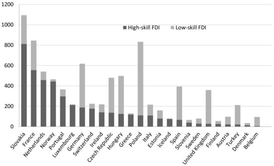 Another channel through which the increased internationalization may influence the job restructuring is inward FDI. While there are several studies that have examined the impact of inward FDI on skill upgrading and job polarization patterns [13,15,16,17], only the work of [18] has analyzed the relationship between inward greenfield FDI and host countries’ labor markets. The advantage of using greenfield FDI is that, differently from cross-border mergers and acquisitions, the decision to open a new facility abroad (i.e., greenfield) is mainly dependent on the relative factor prices, rather than competition or technology acquisition. However, not all greenfield FDI should be treated as equal. Labor-intensive, low-cost, low-skill manufacturing FDI may increase the demand for unskilled labor, while capital-, knowledge- and skill-intensive FDI may lead to more demand for high-skill workers. In this paper, we test this assumption, by studying the relationship between inward greenfield FDI in five distinct activities (one low-skill and four high-skill intensive activities) and the share of employment by occupational skill of European countries.