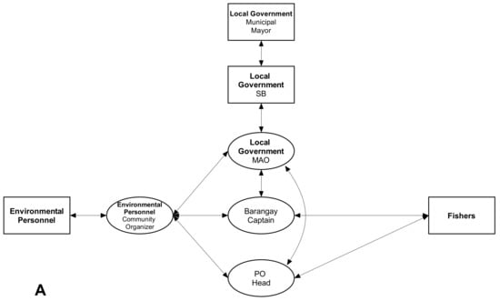 Fishers’ roles in fisheries management are to comply with laws and harvest fish sustainably. They also have knowledge about local fish populations, which is useful to the local government regarding development of legislation to mitigate main drivers of fish decline [43]. It can be difficult for fishers living in remote areas to communicate with other stakeholder types; however, the head of a People’s Organization can be contacted to communicate with local government and environmental personnel. People’s Organizations are independent groups that cluster based on shared interests such as the sustainability of fish populations and facilitate communication between fishers and the local government. The head is voted by the organization to convey the organization’s needs and concerns to other stakeholder groups (Figure 2A).