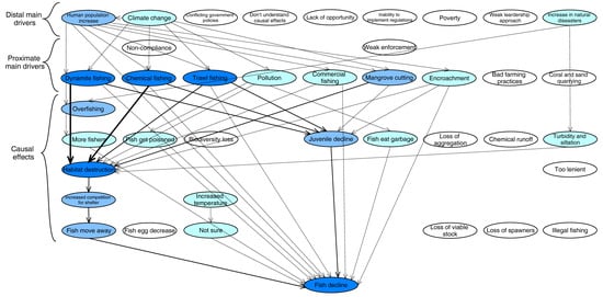 We directly elicited perceptions by having our participants create visual representations of their understanding of the causes and effects of fish decline. This approach deviates slightly from creating traditional causal networks. Instead of response nodes that identify the societal responses to mitigate drivers of decline, our participants identified the interventions that are in place to mitigate specific main drivers (see Niemeijer and Groot, 2006, Figure 3, for a simplified causal network example). Other studies that have used direct elicitation methods to visually represent stakeholders’ mental models are Ozesmi and Ozesmi [53] and Dray et al. [54].