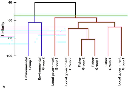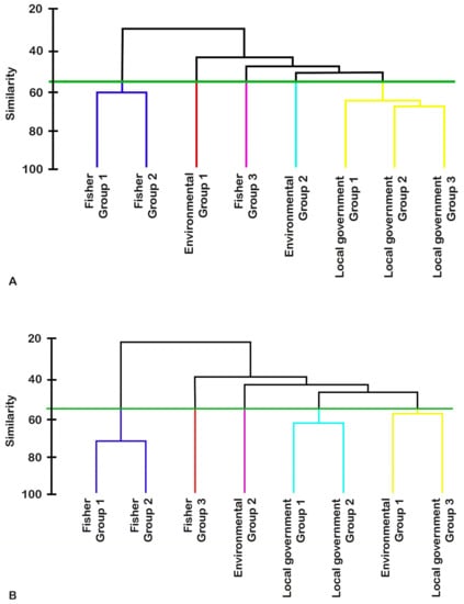 Cluster analysis of perceptions of main drivers of fish decline. (A) Presence of main drivers; (B) Impact of main drivers. Groupings are based on the Bray–Curtis measure of similarity and group average clustering. Similarity on Y-axes ranges from 0–100%. Coloured links indicate clusters of similar perceptions when each dendrogram is cut horizontally at 55% similarity (green lines).
