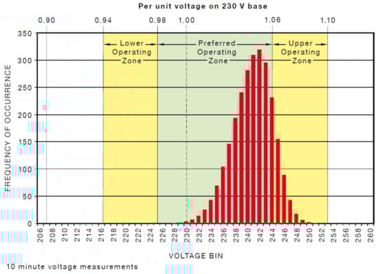 An example voltage distribution compared with lower, preferred and upper operating zones required by the Australian 230 V standard is shown in Figure 1. In contrast to the European adopted EN50160 that requires 230 V ±10% for 95% of time, in Australia the upper (+10%) and lower (−6%) of the 230 V standard is based on the 99th percentile. This means that voltages (over a 10 min average) can exceed the upper and lower limits only 1% of the time under normal network operation. In addition to these point-of-supply voltage standards, AS/NZS 3000 Wiring Rules allow for an additional 5% voltage drop to occur between the point of supply and the point of use within a customer’s premises. Exported energy from rooftop PVs is widely reported to cause voltage rise, particularly at times of high solar radiation and low load, due to the export of real power and the impedance of the system.
