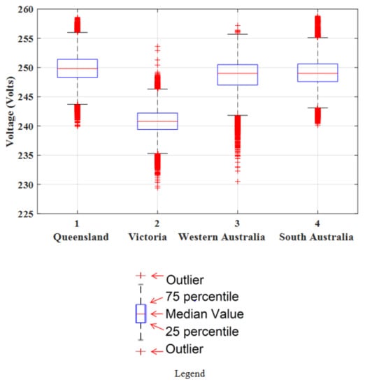 The voltage statistics for 12 months for each of the case study locations is shown in Table 6, revealing the measured mean annual voltage, standard deviation and maximum measured voltage. This is graphically presented for each location in a boxplot (Figure 2). Inside each boxplot, the horizontal red line indicates the median voltage value for each case. The difference between the 75th percentile (the upper side of the box) and the 25th percentile (lower side of the box) is the inter quartile range (IQR). The distance between the upper and lower horizontal black lines (upper and lower whiskers) and the 75th and 25th percentiles is 1.5 times IQR. Any values outside of the whiskers are outliers. Note the variations in mean voltage between the different case studies and the outliers in each, particularly the overvoltage figures.