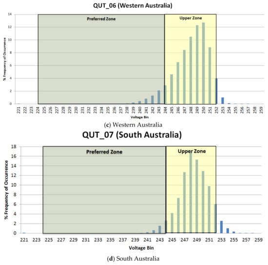 In a similar manner to Figure 1, histograms of voltage distribution were generated (using EXCEL) for each case study to examine the percentage of time the voltage (10 min average) was within preferred limits and upper limits (Figure 3a–d). The new Australian Standard for 230 V (AS 61000.3.100) was used as it is expected that all regions of Australia will adopt this standard sometime in the near future. A comparison of Table 7 and Table 8 with these histograms is revealing: