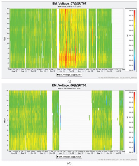 To examine the voltage variations in more detail, MoniSOFT was used to create carpet graphs for each case study (Figure 4a–d): the x axis represents time over the year (1 August 2015–31 July 2016) and the y axis represents hours of the day (0–24). Green areas indicate consistent voltages within the standards whereas yellow to red areas indicate voltages outside of the standard (higher than the standard). These graphs show how voltage varies throughout the day. Note that this specific analysis was carried out using 30 min averages to enable correlation with other data sources: Australian revenue meters (electricity meters for billing purposes); solar radiation data from the Bureau of Meteorology; and electricity industry practice of demand charges being determined at half hour intervals. Some interesting findings from these figures are highlighted below: