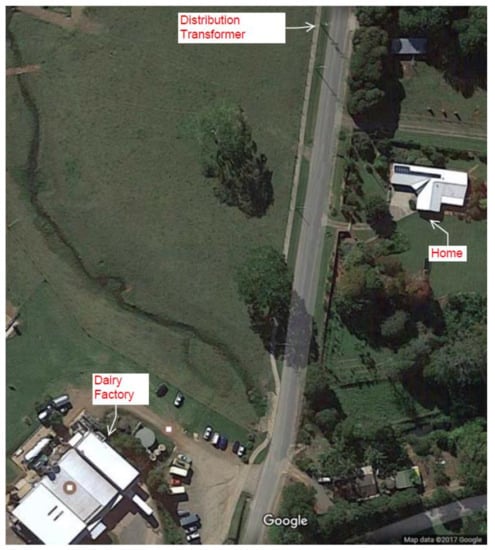 The Queensland house, with poor voltage regulation, is also close to the network transformer (150–200 m), however it is not known what other loads are on this transformer or the rating of the transformer. An aerial shot of this transformer (Figure 6) suggests that it is loaded by a few detached houses and a dairy (industrial user). As this industrial customer is likely to have high energy and power needs (for milking, milk processing, packaging, bottling and refrigeration) it is possible that power quality issues on this transformer are influenced by this industrial customer rather than the PV household. It is also possible that the high voltage readings are a result of historic/current network practices to maintain high voltages at the LV terminal of distribution transformers to allow for voltage drop along the line. This means that customers closest to the transformer have higher voltages compared with customers connected at the end of that line. This house may be the first or second customer connection point to the transformer and it is feasible that the high supply voltage recorded by this customer is a result of DNSP connection and management decisions rather than the household’s PV system.