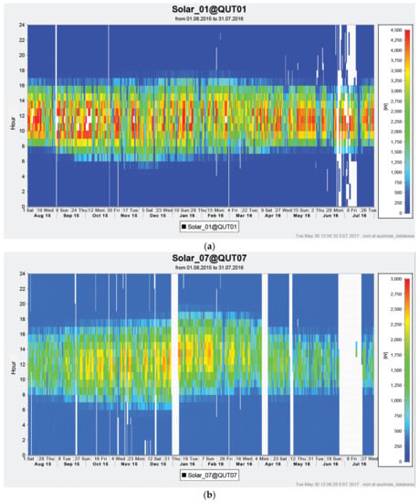Carpet graphs of solar generation were created for the Queensland and South Australian houses (Figure 7a,b) to determine if there were any obvious correlations between high voltage and solar generation at the household level. (Note: similar to Figure 4a–d, this analysis also uses 30 min averages of the 1 min data). Figure 7a shows the total solar generation for the Queensland house between August 2015 and June 2016 at various points during the day. According to the legend on the right, high generation is indicated in red, low generation in green and no generation in blue. A few interesting factors emerge: