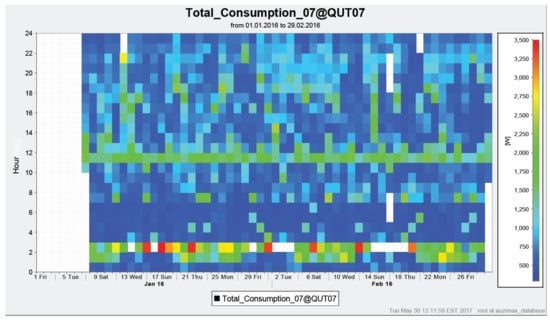 Household loads for the South Australian case study were examined to determine if there was any correlation between household load (and particular appliances) and voltage variations. Figure 8 shows household consumption (all electrical circuits) for January and February 2016 (the time indicated in Figure 4b as having several voltage spikes). The relative energy loads (e.g., light, medium, high) are indicated by colours as shown in the legend. Some trends can be seen, for example a considerable energy consumption spike between 1.45 and 3 am (between 2–3.5 kW) and a smaller spike (around 1.5–2 kW) from 11 a.m. almost every day. There is no obvious regular evening peak.