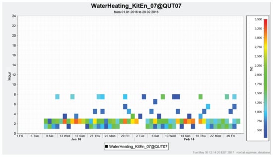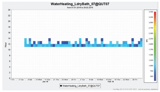 This house also has a heat pump hot water system which provides hot water for the laundry and main bathroom, as well as supplying hydronic floor heating used in winter. Figure 10 shows its main consumption is in the middle of the day (11:00–15:00), corresponding to the 1.5–2 kW peak seen in Figure 8. This appliance has been scheduled by the homeowner to run at this time in order to maximize onsite use of his PV generation. These two appliances—the resistive element hot water storage unit and the heat pump water heater account for the main spikes in energy load shown in Figure 8.
