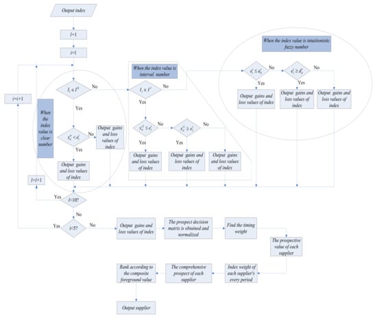 As shown by the variables in Table 2, represents the m green supplier enterprises providing services meeting the functional requirements; is the evaluation index consisting of n indexes; is the set of states of the candidate supplier enterprises in various periods, represents the index value of the green supplier for the ith index at time t, which can be either qualitative or quantitative, and allows for fuzziness and impossible comparison. It can be recorded as in the case of an impossible comparison, and can be expressed as in the form of a partial order or a preference structure in case the order of the index quality can only be obtained in the period where .