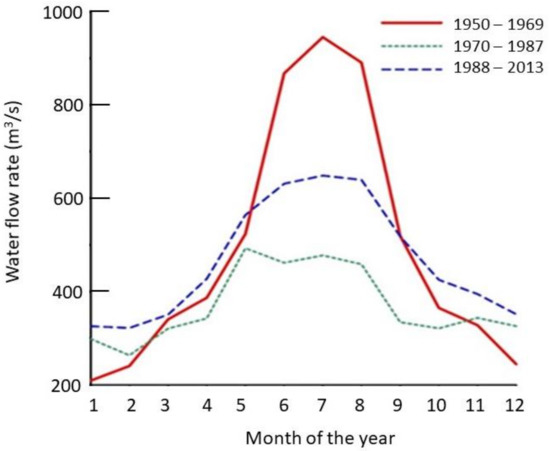 These natural cycles in the lake’s level persisted until 1970, when water was first diverted from the river to fill Kapchagai Reservoir. Thereafter, the inflow from the Ili River, and thus the level of the lake, has been regulated by dams and other upstream hydraulic structures in both countries that share the ecosystem [17,18]. Between 1950 and 1969, the annual Ili River runoff averaged 16.2 km3 (516 m3/s), as measured at Kapchagai. The maximum runoff occurred in July, during the most intensive melting of snowfields and glaciers in the mountains, leading to a pronounced seasonal cycle of river flow (Figure 2). During this period, spring runoff (April–May) averaged 455 m3/s, summer runoff (June–August) averaged 950 m3/s, and autumn–winter runoff (October–March) averaged 321 m3/s.