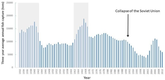 Commercial harvest of fish from Lake Balkhash expressed as 3-year running averages during the interval from 1932 to 2010. The shaded areas indicate early periods of relatively high catch. The raw data are from [4].