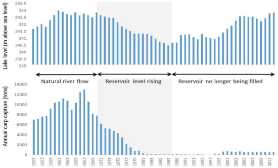 As shown in Figure 4, yields of carp from Lake Balkhash declined precipitously in the decades following the construction of Kapchagai reservoir. Carp harvests tracked the level of the lake’s water rather closely in the years prior to the closure of the dam, when the river was still flowing naturally [42]. This changed between 1970 and 1987, when the reservoir was being filled and the lake’s level was constantly falling. Carp harvests plummeted during this period, to the extent that commercial harvests had nearly vanished within 10 years of completion of the dam. Although diversion of water to raise the level of the reservoir was halted, carp fisheries did not recover in the period after 1987, even though the lake’s level returned to that experienced prior to construction of the dam (Figure 4).