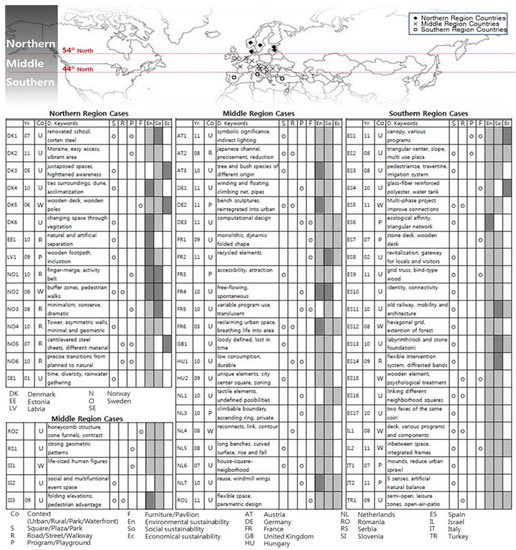 In response to this, in Section 3 we comparably analyzed various kinds of public architecture. The cases were selected because they were popularly utilized as a public design among those constructed throughout Europe since 2000 and considered to be oriented toward urban sustainability. There were 15 cases in the northern region, 28 cases in the middle region, and 22 cases in the southern region. The northern, middle, and southern regions were determined by the latitude being above, between, and below 44 and 54 degrees north respectively.