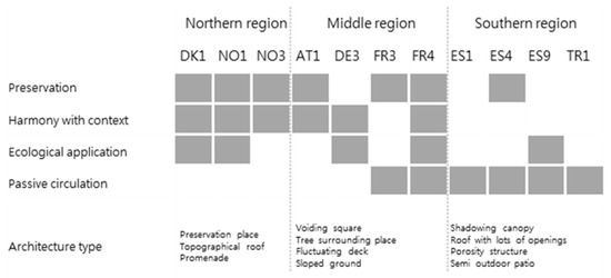 The characteristics of environmental sustainability can be summarized as preservation of the ecosystem, harmony with context, ecological application, and passive circulation. Figure 6 shows a comparison of the features of each region by frequency. In the Northern region, architectural devices such as preservation place, topographical roof, and promenade were commonly used. In the middle region, architectural places such as voiding square, tree surrounding place, fluctuating deck, and sloped ground were frequently seen. In the southern region, architectural objects such as shadowing canopy, roofs with lots of openings, porosity structure and semi outdoor patios were observed as typical types of public architecture.