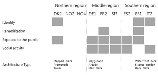 The characteristics of social sustainability can be summarized as identity, rehabilitation, exposed to the public, and social activity. Figure 7 shows the comparison of the features of each region depending on frequency. In the Northern region, architectural devices such as stepped plaza, promenade, and tower appeared. In the Middle region, architectural sites such as playground, arcade, and stair plaza were frequently seen. In the southern region, architectural objects such as waterfront deck, 5 sense garden, and deck plaza were typical types of public architecture.