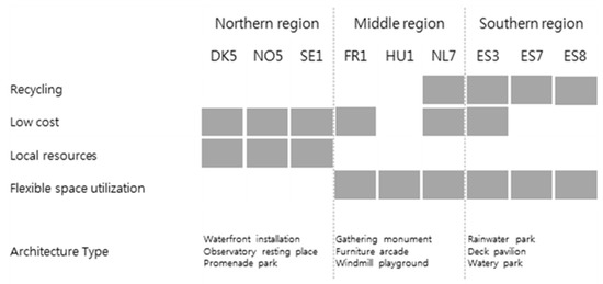 The characteristics of economic sustainability can be summarized as recycling, low cost, local resources, and flexible space utilization. Figure 8 shows a comparison of the features that are highlighted frequently in each region. In the Northern region, architectural devices such as waterfront installations, observatory resting places, and promenade parks could be seen. In the Middle region, architectural places such as gathering monument, furniture arcade, windmill playground were frequent. In the southern region, architectural objects such as rainwater parks, deck pavilion, and watery park were typical cases of public architecture.