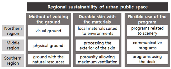 In the northern region, visual ground is effective because it is suitable for the architectural form as scenery. In this case, if memory that reinforces the local identity is embedded, it will intensify social sustainability. In the middle region, the focus should be on the physical ground that people use directly. It emphasizes environmental sustainability by enabling people to maintain a pleasant environment during use. In the southern region, ground that combines natural resources such as water or wood to cope with high temperatures is effective. This is also related to economic sustainability, which has a cost saving effect.