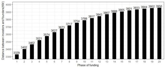 Figure A1 shows the average distance between investors and founders in different phases of funding (200 plus investors). The distance between investors and founders is calculated in kilometers. The duration of the investment is divided evenly into 20 phases. As seen in Figure 1, the average distance between the two sides is 2877 km in the first phase. As funding progresses, the distance between the two sides spreads gradually and reaches 3217 km in the 8th phase before gradually decreasing to 2894 km in the last phase. The distance between investors and founders for the campaigns with 200 plus investors shows an n-shape trend.