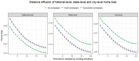 The duration is uniformly divided into 20 phases, and the differences between successful projects and failed campaigns in the distance diffusion are compared. Figure 2 shows the distance diffusion at national-level, state-level, and city-level home biases in the pool data. We can see that national-level home bias is the most intense, followed by state-level, and finally city-level. The home bias declines over time, which is confirmed at all levels.