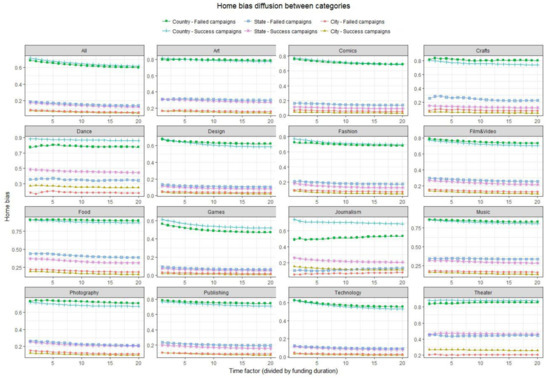 The great differences between categories may be caused by the nature of the projects themselves and the preferences of the investors, among which technology projects and theater projects are two opposite examples. Transnational investment on technology projects is a common investment phenomenon, therefore the home bias for technology projects on the national level is not obvious. On the contrary, culture shows a significant impact on theater projects because investors tend to invest in the projects with similar culture [26,27]. The difference in the nature of such projects directly leads to differences in the behavioral pattern of the investors. Investors of theater projects prefer to invest in the projects in the same country as the fundraisers. This phenomenon is particularly evident in the state level and city level. That is, investors prefer theater projects from the same state or city. Another possible reason is the offline market’s impact on online finance. In general, campaigns such as food and theater rely strongly on geographical position. Investors prefer projects with the similar culture and habits as themselves, therefore the offline preference affects the behavior patterns of online investment of the crowdfunding pitch.
