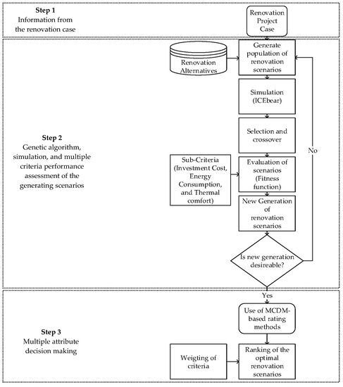 The HMSR has been built upon the research study in [15]. The HMSR includes three decision levels within a sequence of 23 activities in which a renovation project can primarily be explored; the problem is structured, the scenarios are generated and improved, and ultimately the decision is made at level 3 about which renovation scenario to pursue at the end of the design process. The HMSR, in the decision level 2, distinguishes between evaluation of hard (quantitative) and soft (qualitative) criteria. It therefore proposes the application of a DSS [6,16,17] that can be used for the generation and evaluation of the holistic renovation scenarios focusing on the hard (quantitative) criteria. The top ranked evaluated scenarios in this stage are further improved concerning the soft (qualitative) criteria. The developing DSS in the present paper is attached to the principles of the proposed DSS in the main body of HMSR for the generation and evaluation of the simulation-based performance of holistic renovation scenarios for an apartment block. As such, a hybrid DSS including a search algorithm with Genetic Algorithms (GA) is introduced and used to combine renovation approaches, as well as simulations and MCDM methods to cope with the selected [hard] criteria and renovation approaches for the development and evaluation of holistic renovation scenarios. The performance of the generated scenarios is simulated and evaluated in terms criteria for Energy Consumption, Investment Cost, and Thermal Indoor Comfort.