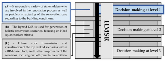 As explained in Section 1, the developing DSS in the present paper is attached to the principles of the use of a proposed DSS in the decision-making level 2 at the HMSR (see ‘B’ in Figure 4). It hence is used into the main body of HMSR. Following the activities that have been designed for decision-making level 1 at the HMSR (see ‘A’ in Figure 4), the renovation project is explored, relevant stakeholders are identified, and their demands or their relevant concerns are investigated; then, the design objectives are set up. Thereafter, and by moving into decision-making level 2, the hybrid DSS is used for generation of holistic renovation scenarios, focusing on hard (quantitative) criteria (see ‘B’ in Figure 4). This means step 1 in Figure 3 is parallel to the performing activities in decision-making level 1 in the HMSR and is instinctively carried out if the developing DSS in this paper is used within HMSR methodology. Consequently, the outcome of this step influences selection of the criteria, as well as development of the database including detailed properties of the different renovation alternatives.
