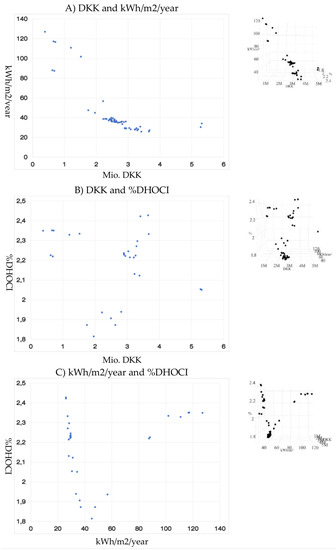 With application of Pareto-front approach, a landscape of the 55 remaining non-dominated scenarios is illustrated in a 3D scatter plot within the three evaluation criteria, see Figure 6. A Pareto-front is clearly visible between the cost and the energy consumption in Figure 6A. The cost varies between less than 1 Mio. DKK to above 5 Mio. DKK. Energy consumption varies between 20–30 kWh/m2/year and above 120 kWh/m2/year.