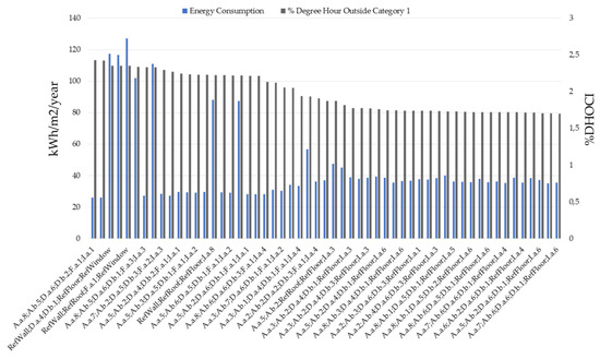For more clarification, Figure 7 represents the 55 non-dominated scenarios with the associated energy consumption and % DHOCI. The scenarios are listed with their reference number as per the database represented in Appendix A. The notation “Ref” before a building component means that this component was not renovated in the scenario. In next step, these are used to develop the ranking of optimal scenarios.