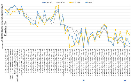 In order to make an informed decision upon the performance of the 55 scenarios, the previously described MADM methods including AHP, TOPSIS, WSM, and ELECTRE are applied for ranking. The rankings are based on an equal weighting of all criteria, which may not be the case for an actual renovation as stakeholders may have different opinion about the importance of the different evaluation criteria. The results are represented in Figure 8. The ranks differ depending on the used MADM method but their trends are following each other. It is observed that TOPSIS and AHP methods present exact similar rankings.