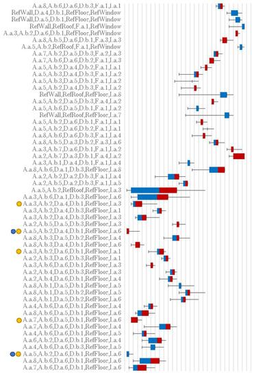 The scenarios on the lowest part of the graph in Figure 8 include renovation scenarios for all components except the floor. These scenarios are generally preferable according to the MADM methods. Two scenarios marked with a blue dot: