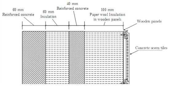 As part of the actual renovation, all walls have been renovated, and 100 mm additional external paper wool insulation has been applied in wooden panels mounted to the existing external walls. A combination of concrete screen tiles and wooden plates has been used as exterior final finish that may not be the cheapest alternative but could improve the impression of the building. The construction detail for renovated wall is illustrated in Figure 11.
