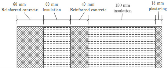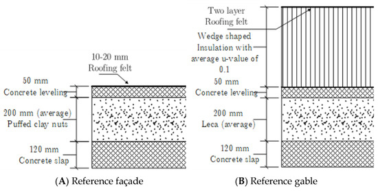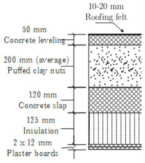 All roofs have been renovated, with additional external insulation. The existing roof before renovation consisted of a 120 mm concrete slab, on top of which a layer of averagely 200 mm puffed clay nuts creating a slope for drainage, and subsequently a 50 mm screed concrete layer finished with 10–20 mm roofing felt, as illustrated in Figure 13. The combined U-value of the reference roof is calculated to 0.41 m2K/W, compared with the maximum allowed U-value of roofs of 0.1 m2K/W today cf. [50]. Perhaps, based on this indication, the renovation description describes that additional, wedge-shaped pressure resistant insulation with a maximum combined U-value of 0.1 m2K/W must be added on the roof as illustrated in Figure 13.